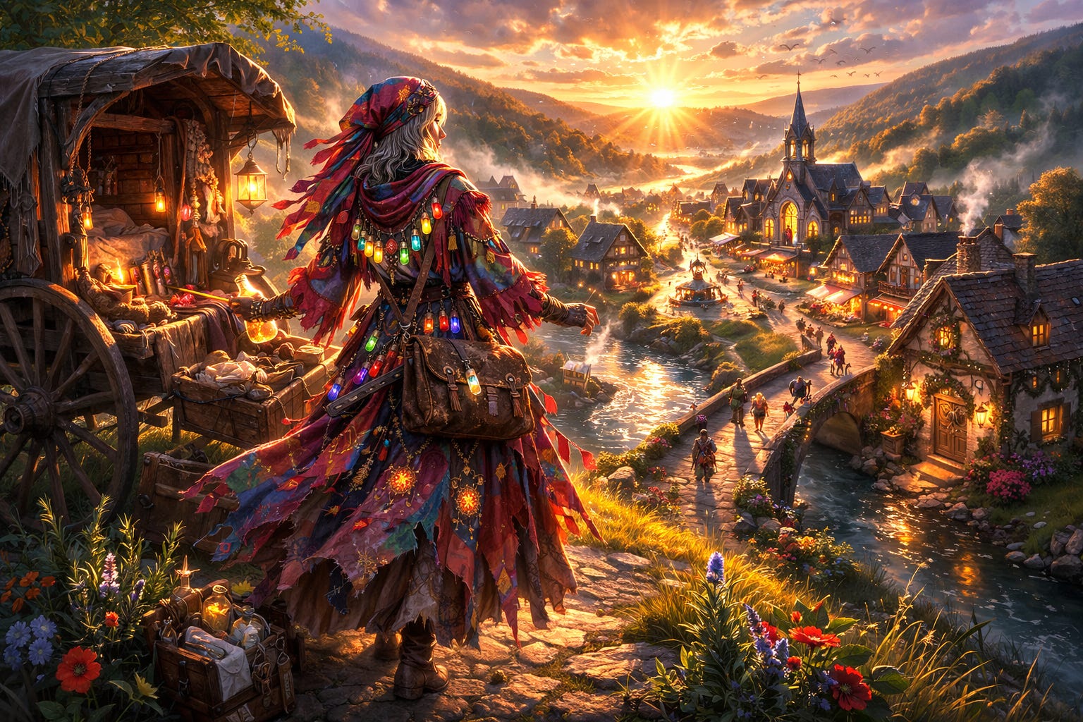 A mile outside Larkhollow, she stopped at a rise where the valley spread below like a bowl full of waking. The sun hit her coat and set the colors aflame. For a moment, she looked like a person made of festival banners and chapel light.