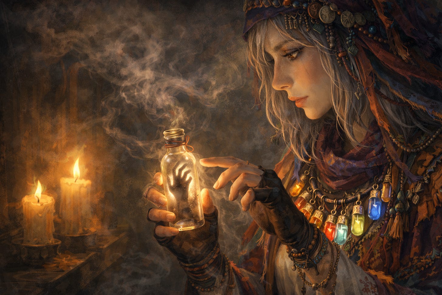 The necklace of vials at her throat chimed when she walked, a sound like glass thinking about singing. Each charm held a different weather, amber fog, violet lightning, sea-green hush. They were beautiful the way knives can be beautiful.