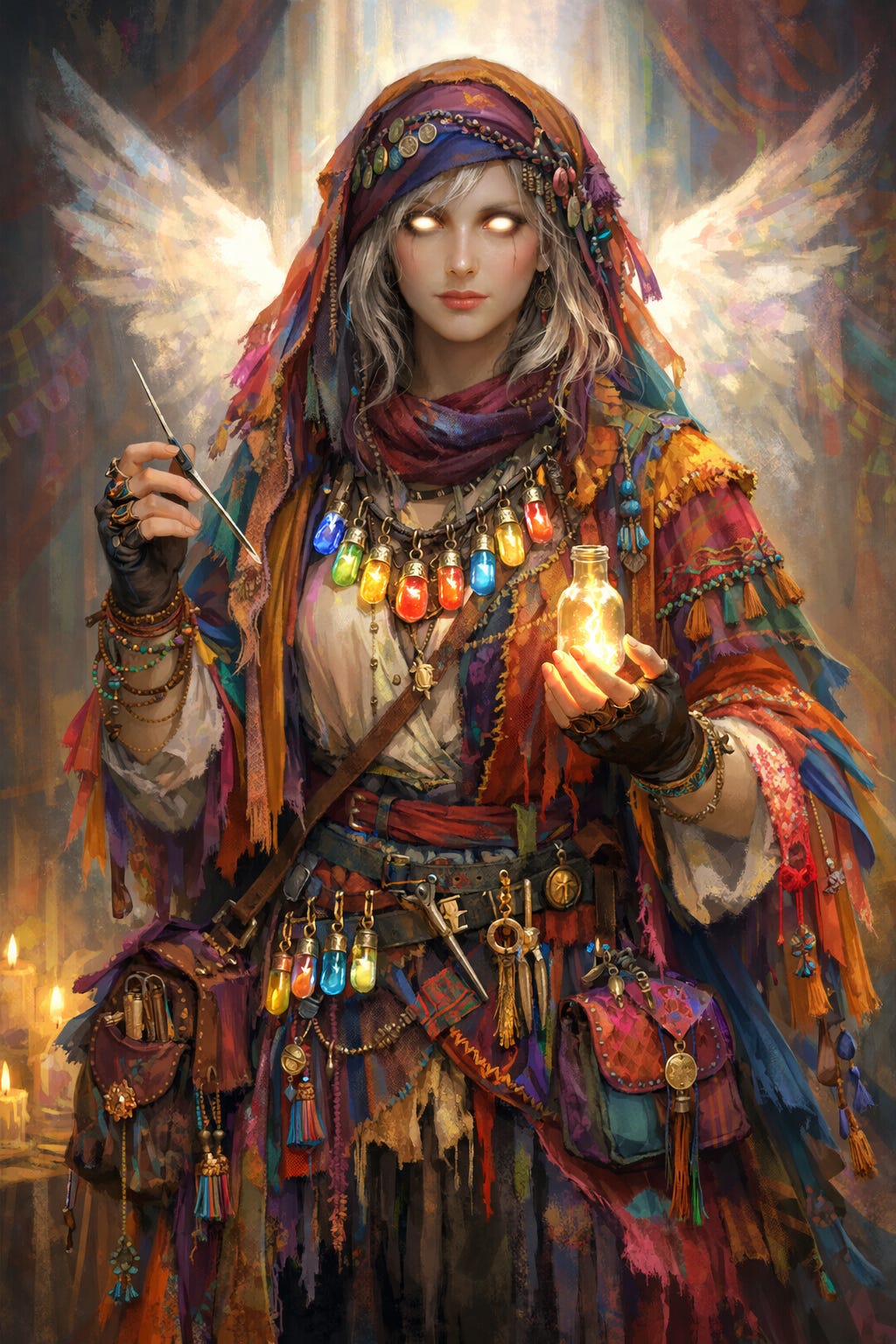 Marrow “Sorrowglass” Vell stepped down from the driver’s bench with her satchel in one hand and her other hand already reaching for nothing, checking the air the way a musician checks a room for echo. The hem of her patchwork coat flashed a riot of color when it caught the lamplight, embroidered suns beside stitched moths beside tiny constellations that were not quite accurate. Her scarf, bright as spilled paint, hid most of her hair, but it could not hide the faint radiance of her skin, the soft, chapel-window glow that seeped out when she was tired or telling the truth.
